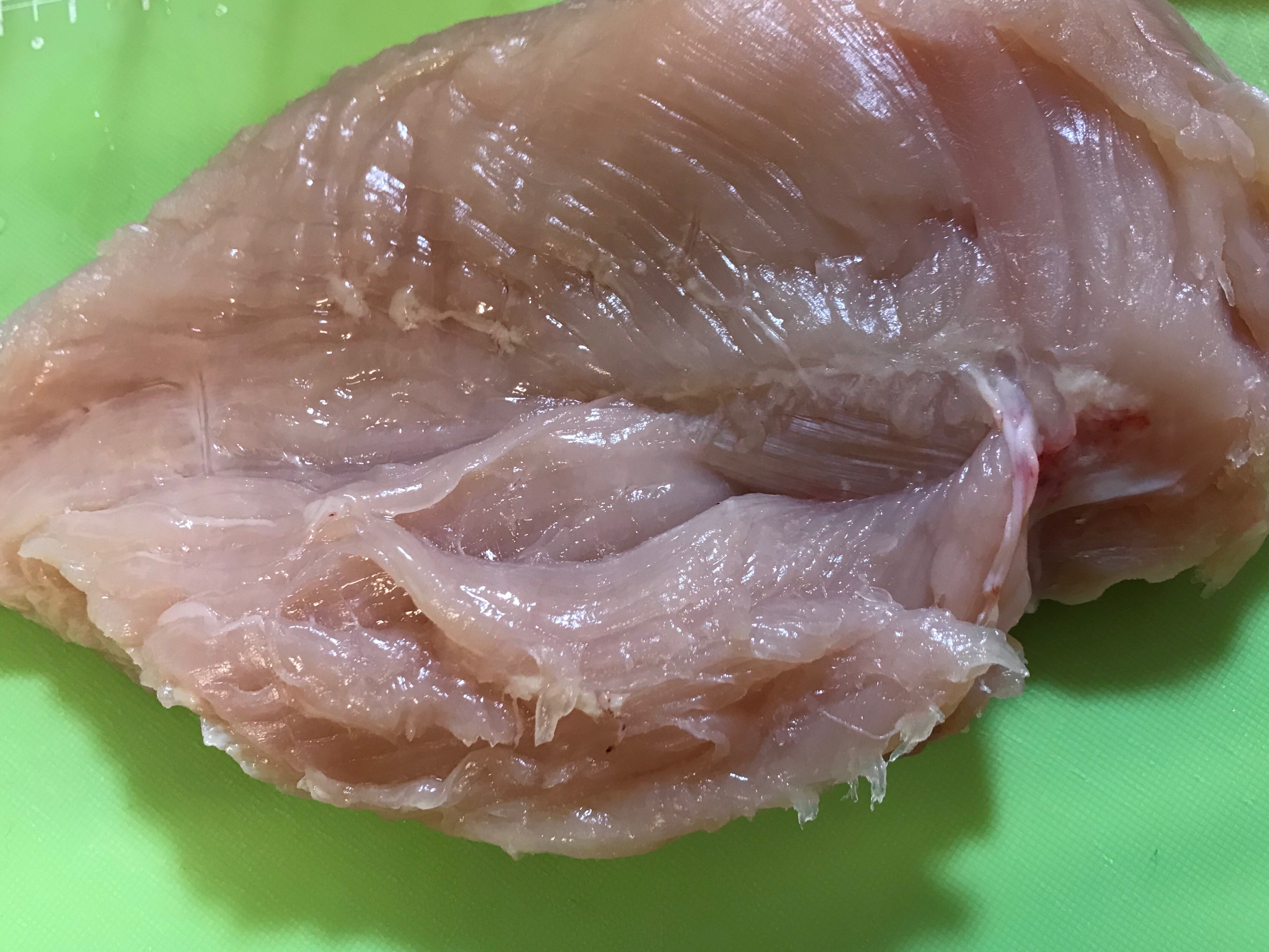 Maco 犬用ササミジャーキーの作り方 ササミをスライス サランラップで包んで綿棒で叩き平たくした方がよりジャーキーっぽく仕上がるけれど今回はスライスのみ 600wで3分レンチン 裏返し さらにチン 全体的にパサパサに トースターで焦げ目がつく程度